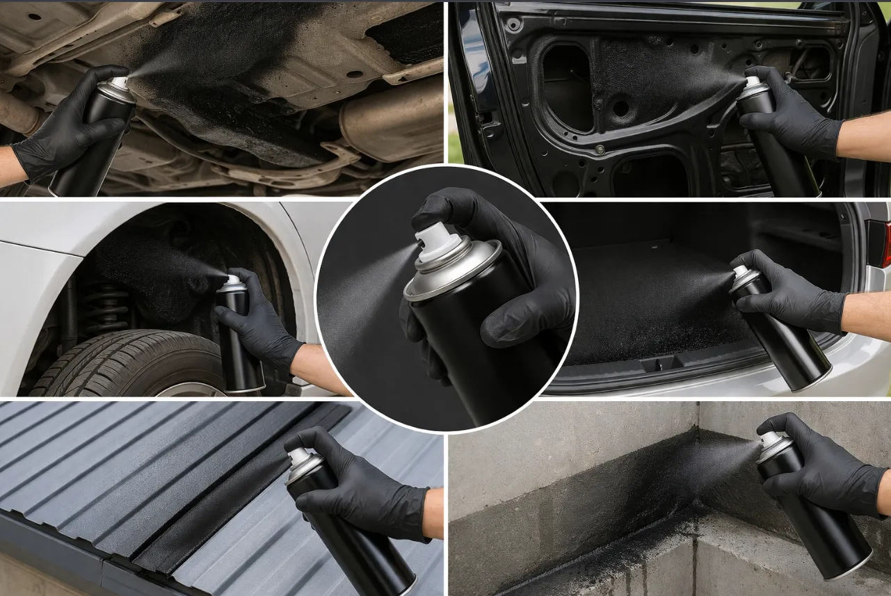 Profesjonalny spray uszczelniający na bazie kauczukowo-żywicznej, wolny od bitumu. Po aplikacji tworzy trwałą, elastyczną i szczelną powłokę ochronną, odporną na działanie czynników atmosferycznych oraz uszkodzenia mechaniczne (np. odpryski kamieni), działa jako izolacja.